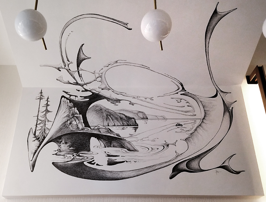 Permanently mounted on wall and ceiling panels, the mural is 8 x 8 feet.
