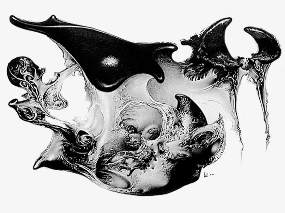 Biomorphic entities evoking marine flora and fauna are rendered with geological textures and dramatic light.