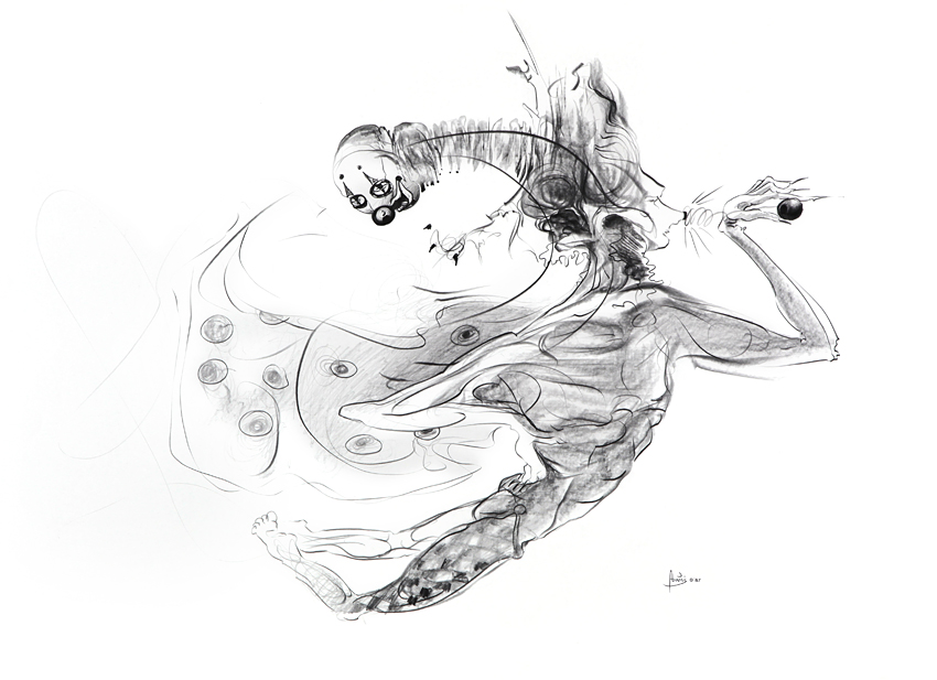 Harlequinact, 1986, graphite on paper, 25.5 x 33 inches.
